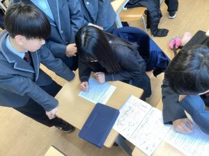 写真は、メロスの朗読に真剣に取り組む生徒たちです。ひとつひとつの言葉にこだわって読むよう、声かけをしています。また、授業で使った板書プリントを見て話し合う姿も撮影させてもらいました。