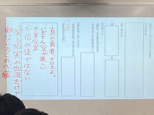 初読の際、生徒たちの反応は「メロス擁護派」と「メロス批判派」に大きく分かれました。私たちは、その時に生じた「違和感」を大切にしながら授業を進めています。