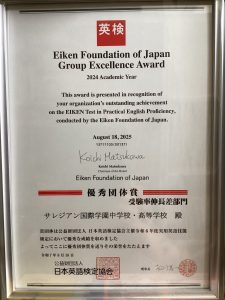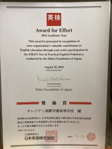 英語科で毎年取り組んでいる英検に関して、協会より表彰状を頂きました。