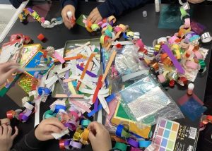 私たち中学2年生は、4階の高1C、Dクラスで学年テーマの芸術表現に沿って、スクラッチアートで〇〇作り体験とミニチュアフェイクフード作り体験を行っています。